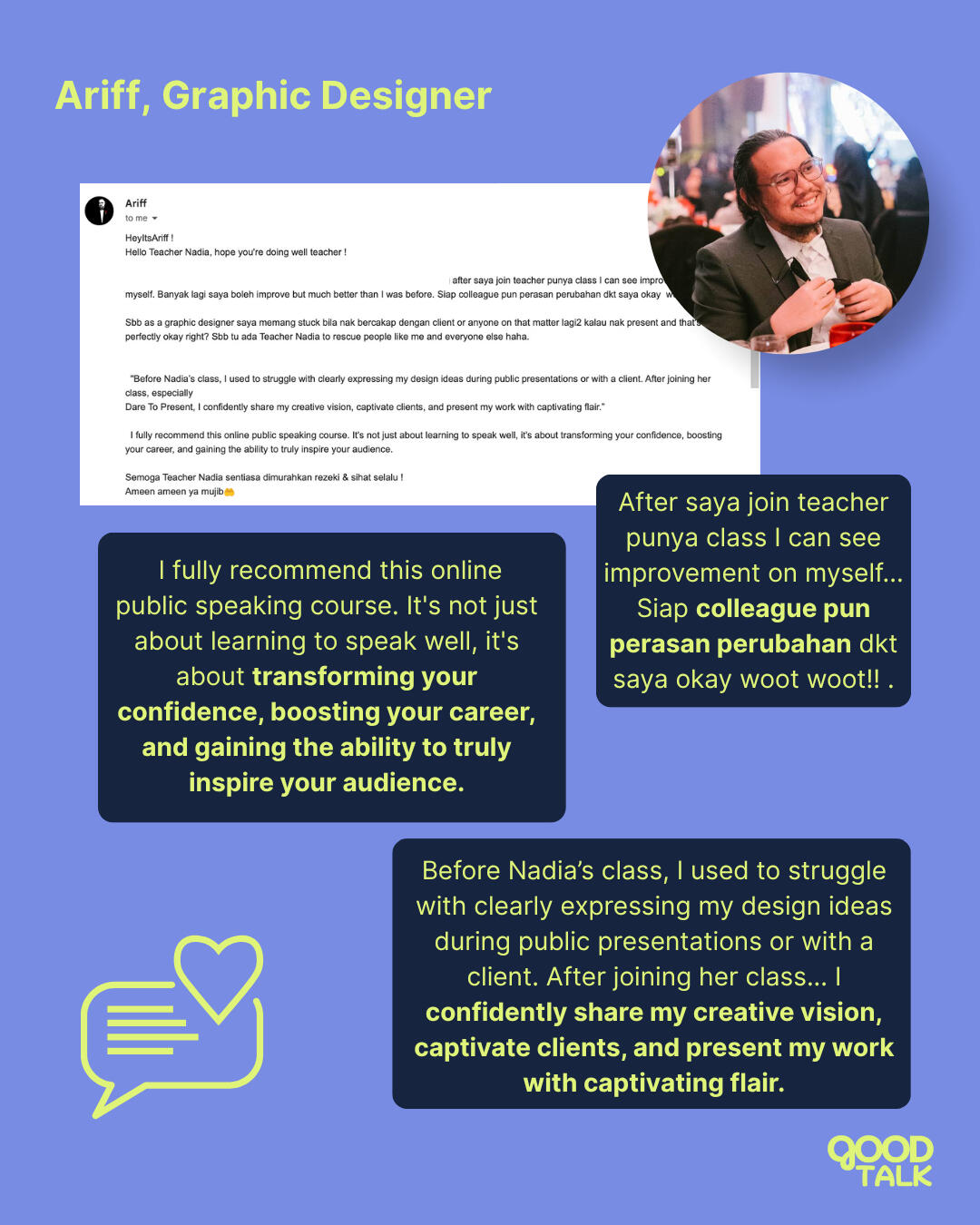I got my start on 8TV’s Quickie back in 2013, which unexpectedly kicked off a pretty wild broadcasting ride. For the last decade, I’ve bounced around FlyFM, Astro, HyppTV, just to name a few. Yeah, I’ve also emceed corporate gigs for brands you might know like Rexona and Dutch Lady.But the real highlight? Five seasons with the Asian LeMans Series. Japan, China, UAE, Thailand… fast cars, me in a race suit and broadcasting live to 20 million people around the world. That’s something I won’t forget.More than 10 years of talking for a living taught me a few things about connecting with people, and, more importantly, how not to bore them to death. Now, if you’re looking to find your voice and avoid sounding like a corporate robot, I’m here to help.